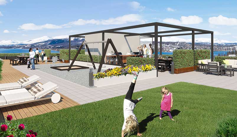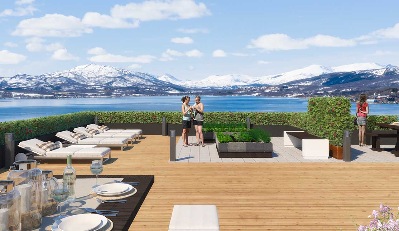På toppen av bygget finnes en eksklusiv takterrasse som alle leilighetseiere kan benytte. Denne er utformet med ulike miljø hvor en kan finne sin plass til sitt formål.
